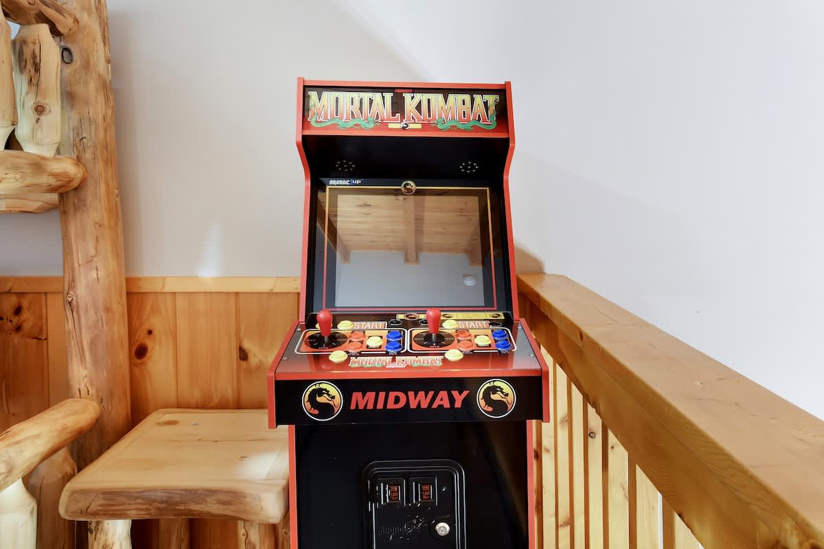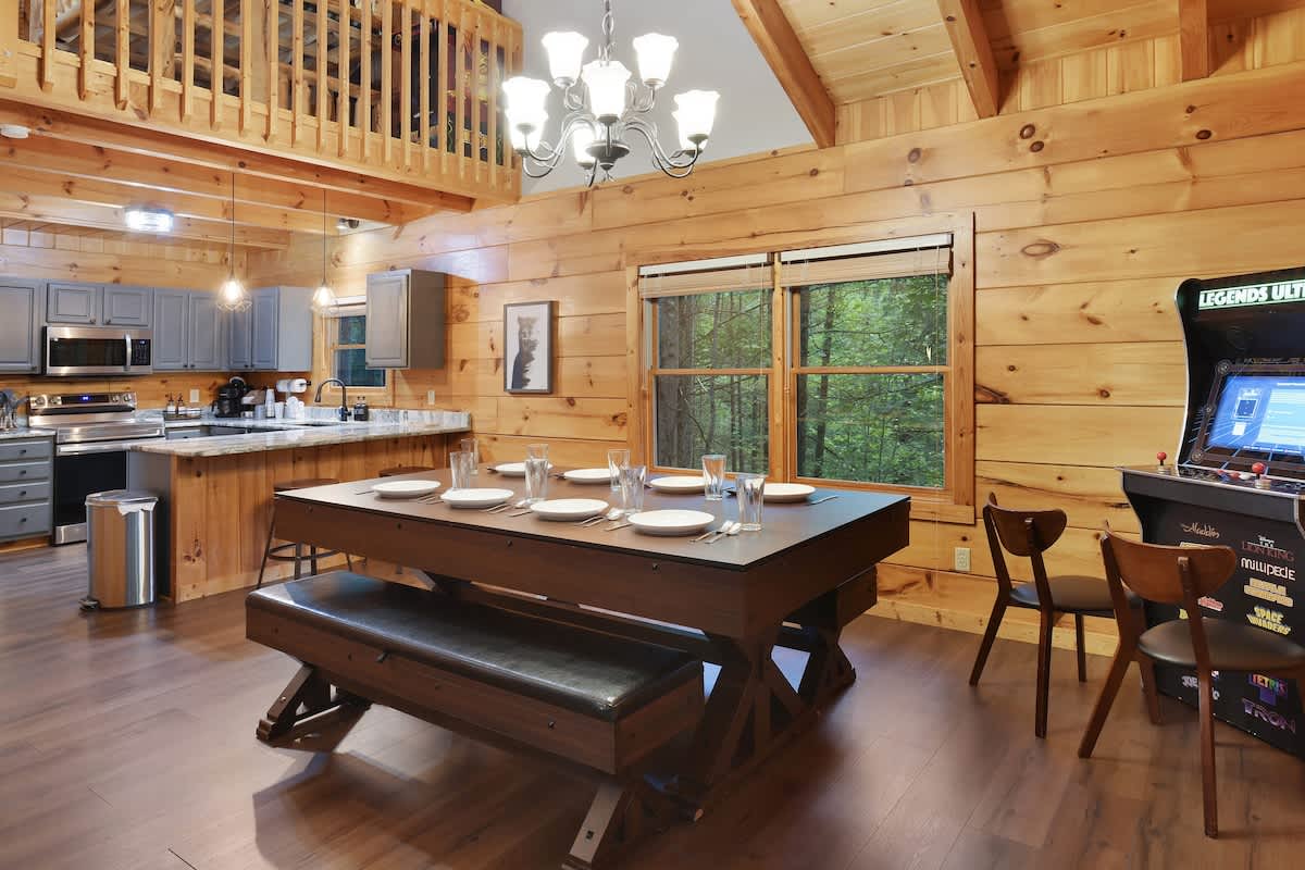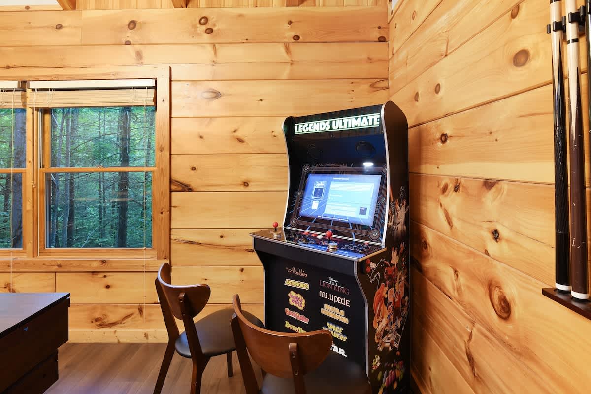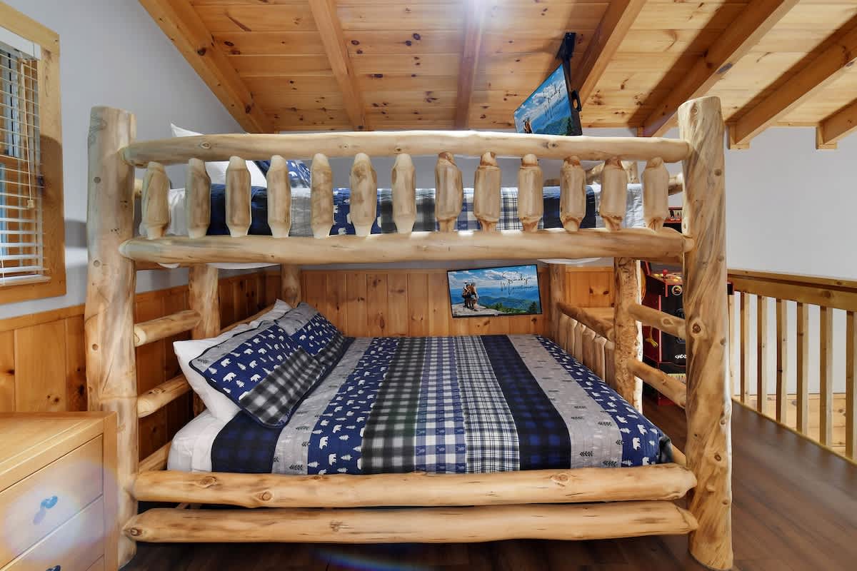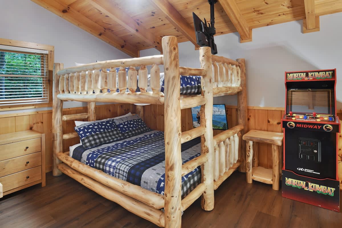 Welcome to Bear Bottom Cabin, your perfect getaway in Gatlinburg! This cozy retreat features a luxurious king bedroom with an ensuite bathroom and a relaxing Jacuzzi tub. Unwind by the electric fireplace or enjoy your favorite shows on the Roku TV. Upstairs, the loft area boasts a queen-over-queen bunk bed with its own full bathroom. Each bunk features a Roku TV equipped with headphone jacks for a private viewing experience. The loft also features an arcade gaming machine for some fun family competition! The spacious living room invites you to gather with loved ones, featuring another electric fireplace, a sleeper sofa, a smart TV, and ample seating for everyone. Enjoy meals at the dining table that seats 8, which cleverly converts into a ping pong and pool table for added entertainment. Plus, there’s an arcade cabinet loaded with classic games for nostalgic fun. The fully stocked kitchen makes meal prep a breeze, and the laundry room just off the kitchen includes a washer and dryer for your convenience. Step outside onto the private balcony, where you’ll find a cozy couch around a fire table and a hot tub with stunning forest views, perfect for relaxation after a day of adventure. 🛌 Sleeping Spaces 🛌 ✔️Bedroom 1 - 1 King Bed, Streaming TV, jetted tub, ensuite bathroom, electric fireplace (2 Guests) ✔️Loft - 1 Queen over Queen bunk bed, 2 streaming TV's, ensuite bathroom (4 Guests) ✔️Living Room - Pull out Queen sofa bed (2 Guests) 🎮 Entertainment 👾 ✔️Private Hot Tub ✔️Playstation 5 ✔️Mortal Kombat Arcade ✔️Multicade Arcade System ✔️Pool Table ✔️Ping Pong Table ✔️Board Games ✔️Puzzles ✔️5 Streaming TV's (Living Room TV has cable TV service) 🥩 Cooking Spaces 🌭 ✔️Fully stocked kitchen ✔️Coffee - Dual pods and drip style coffee maker ✔️Gas Grill ✔️Charcoal Grill ⛰️ Location 🌲 ✔️Located in Gatlinburg, just 1/2 mile to The Parkway and only 3 miles to Downtown Gatlinburg! ✔️Located just 7 miles to The Island in Pigeon Forge 🚗 Parking & Driving 🚙 ✔️2 Vehicles fit best but 4 can fit if you use the incline part of the driveway. No trailers allowed as it's challenging to navigate the road with a trailer. The last 1/2 mile drive to this cabin is on a winding road with some steep roadways. 🎖️ Military, Veteran, Police & Firefighter Discount 🚔 We are proud to offer all Current Military, Veterans, Police & Firefighters a 5% discount. In order to receive this discount, you must make your reservation first then send us a message in Air BnB with a copy of your proof of service. The name on the reservation and payment must match the name on the proof of service. We will then refund 5% of the accommodation back to you in the resolution center the day after your check-in Property ownership Info: Douglas Foyt