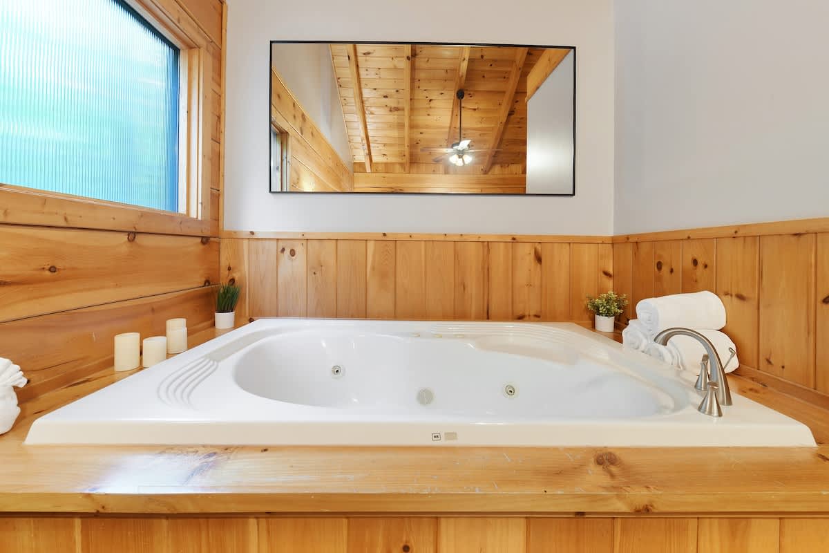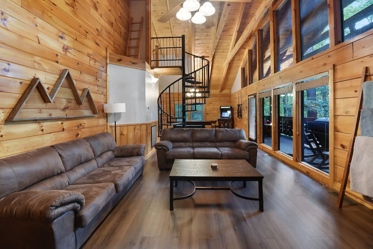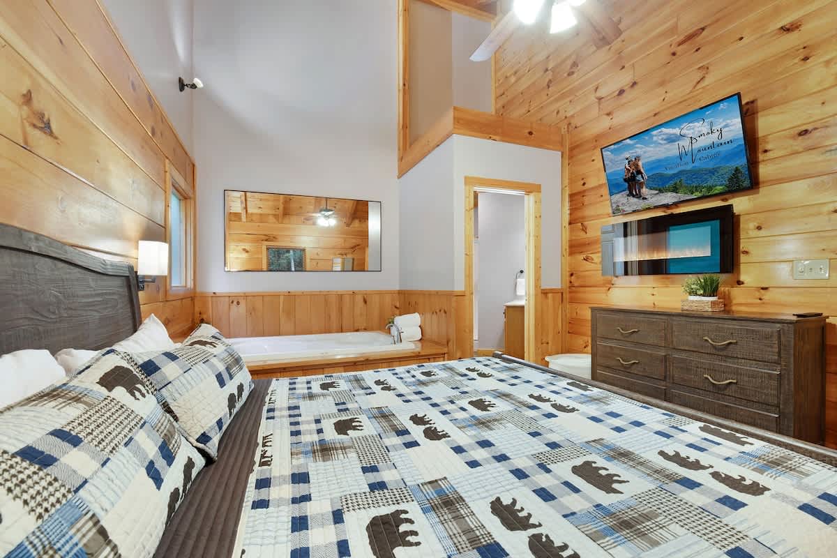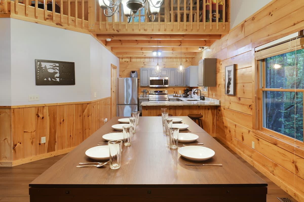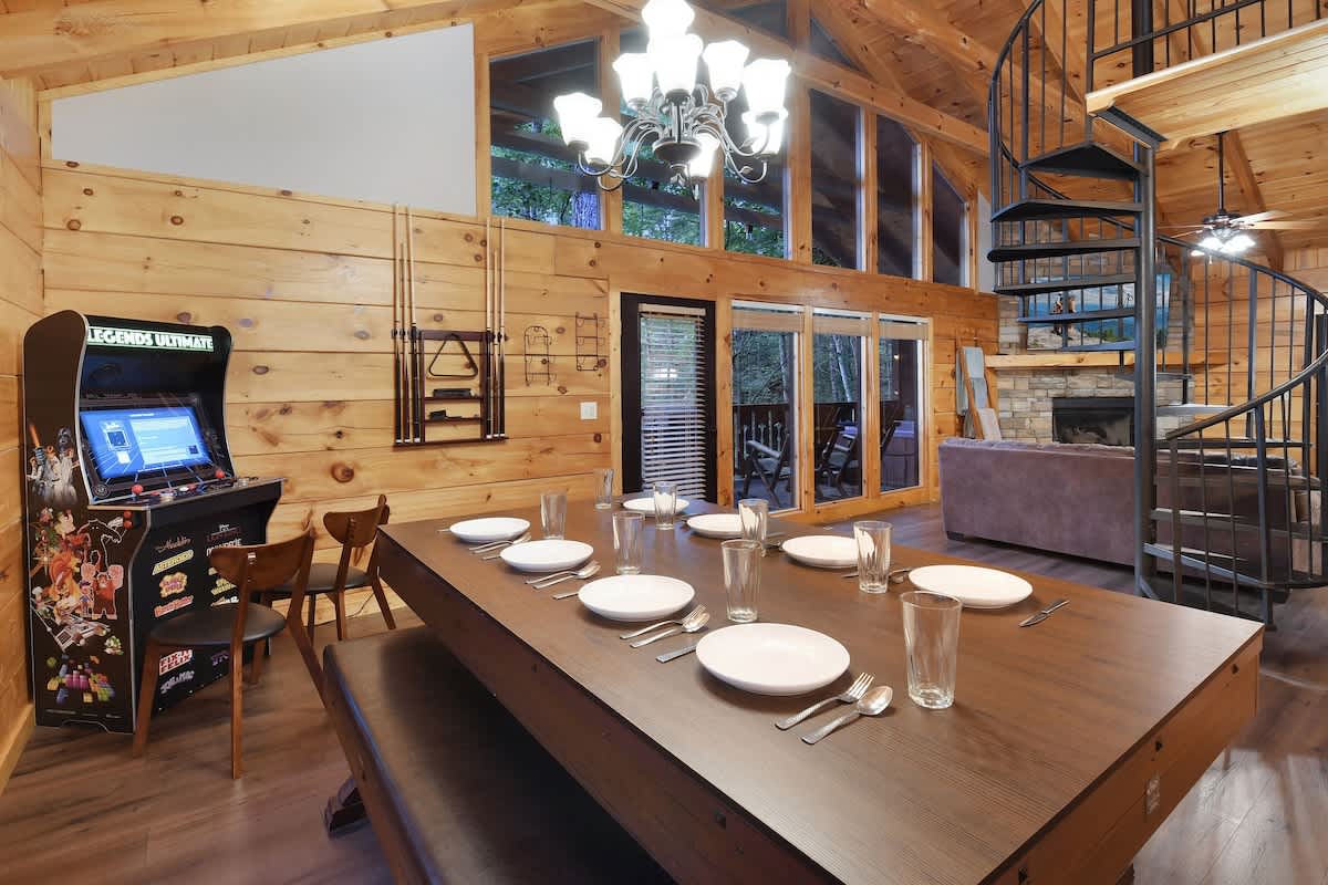 Welcome to Bear Bottom Cabin, your perfect getaway in Gatlinburg! This cozy retreat features a luxurious king bedroom with an ensuite bathroom and a relaxing Jacuzzi tub. Unwind by the electric fireplace or enjoy your favorite shows on the Roku TV. Upstairs, the loft area boasts a queen-over-queen bunk bed with its own full bathroom. Each bunk features a Roku TV equipped with headphone jacks for a private viewing experience. The loft also features an arcade gaming machine for some fun family competition! The spacious living room invites you to gather with loved ones, featuring another electric fireplace, a sleeper sofa, a smart TV, and ample seating for everyone. Enjoy meals at the dining table that seats 8, which cleverly converts into a ping pong and pool table for added entertainment. Plus, there’s an arcade cabinet loaded with classic games for nostalgic fun. The fully stocked kitchen makes meal prep a breeze, and the laundry room just off the kitchen includes a washer and dryer for your convenience. Step outside onto the private balcony, where you’ll find a cozy couch around a fire table and a hot tub with stunning forest views, perfect for relaxation after a day of adventure. 🛌 Sleeping Spaces 🛌 ✔️Bedroom 1 - 1 King Bed, Streaming TV, jetted tub, ensuite bathroom, electric fireplace (2 Guests) ✔️Loft - 1 Queen over Queen bunk bed, 2 streaming TV's, ensuite bathroom (4 Guests) ✔️Living Room - Pull out Queen sofa bed (2 Guests) 🎮 Entertainment 👾 ✔️Private Hot Tub ✔️Playstation 5 ✔️Mortal Kombat Arcade ✔️Multicade Arcade System ✔️Pool Table ✔️Ping Pong Table ✔️Board Games ✔️Puzzles ✔️5 Streaming TV's (Living Room TV has cable TV service) 🥩 Cooking Spaces 🌭 ✔️Fully stocked kitchen ✔️Coffee - Dual pods and drip style coffee maker ✔️Gas Grill ✔️Charcoal Grill ⛰️ Location 🌲 ✔️Located in Gatlinburg, just 1/2 mile to The Parkway and only 3 miles to Downtown Gatlinburg! ✔️Located just 7 miles to The Island in Pigeon Forge 🚗 Parking & Driving 🚙 ✔️2 Vehicles fit best but 4 can fit if you use the incline part of the driveway. No trailers allowed as it's challenging to navigate the road with a trailer. The last 1/2 mile drive to this cabin is on a winding road with some steep roadways. 🎖️ Military, Veteran, Police & Firefighter Discount 🚔 We are proud to offer all Current Military, Veterans, Police & Firefighters a 5% discount. In order to receive this discount, you must make your reservation first then send us a message in Air BnB with a copy of your proof of service. The name on the reservation and payment must match the name on the proof of service. We will then refund 5% of the accommodation back to you in the resolution center the day after your check-in Property ownership Info: Douglas Foyt